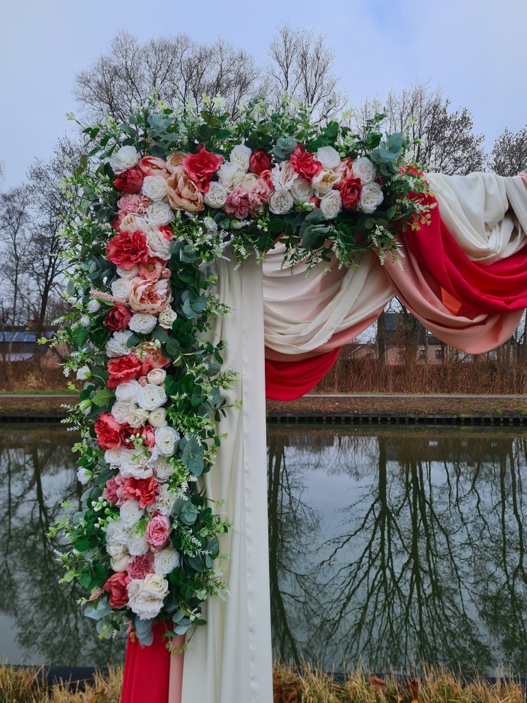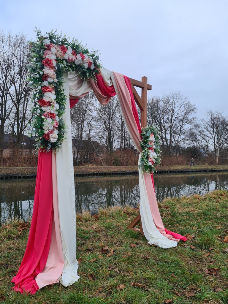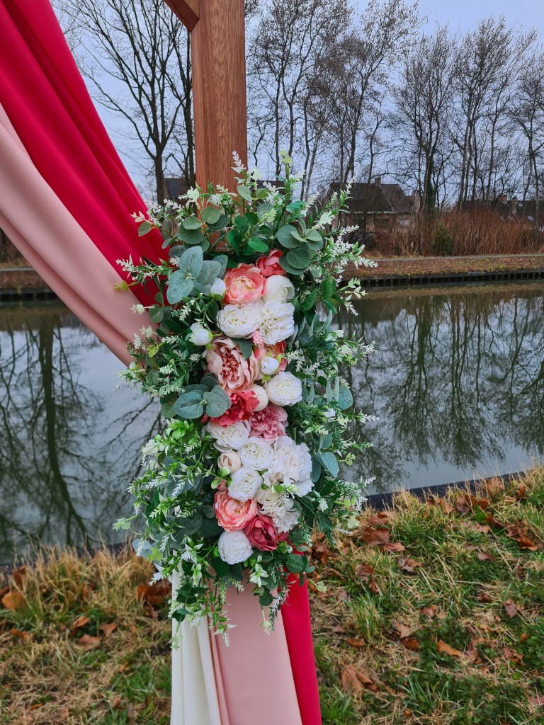 Inbegrepen: Houten boog + bloemstukken + 3 doeken + bevestigingsmateriaal