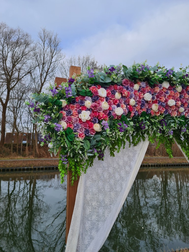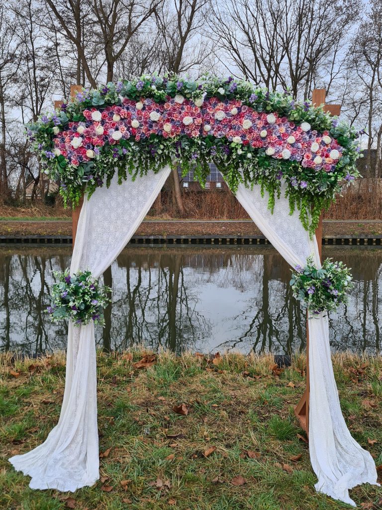 Inbegrepen: Houten boog + bloemstukken + 2 gordijnen + bevestigingsmateriaal